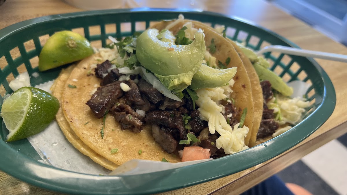 Fresh and flavorful ingredients! The service was friendly and fast, and the quality of the ingredients was top notch. We had carne asada tacos with cilantro, onions, lime, cheese and avocado and enjoyed every last bite. We can't wait to come back and try their burritos. There is some seating inside, but not a ton so I wouldn't recommend coming with a big group of people, instead you can do carry out and leave the adorable booths for groups of 2-4. There is also a bar along the window with stools.